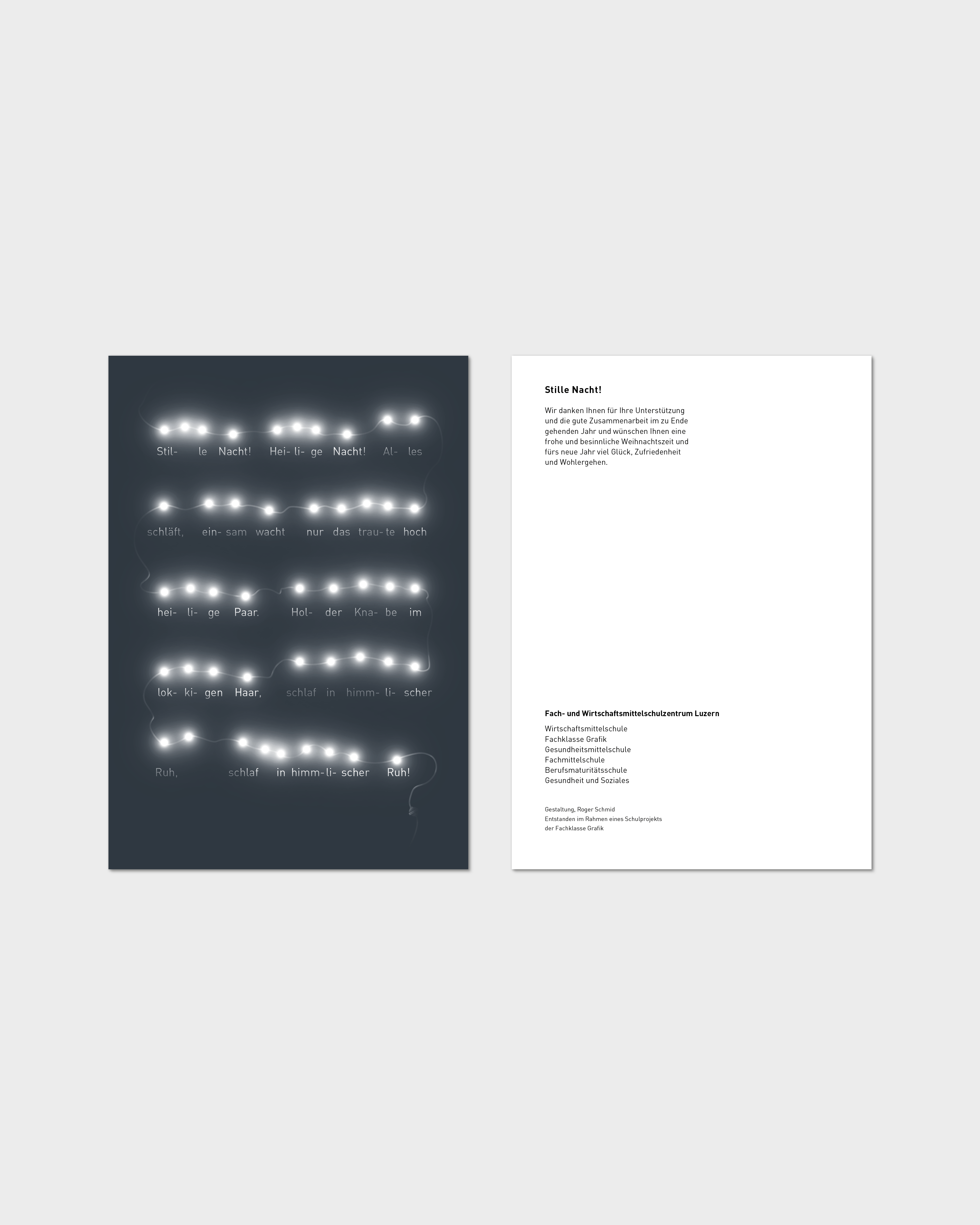Im Auftrag des Fach- und Wirtschaftsmittelschulzentrums Luzern, haben wir in der Fachklasse Grafik, Karten für die Weihnachtszeit 2013 gestaltet. Die Karte «Stille Nacht» fand den Weg durch die kalte Jahreszeit in die Stuben von Bekannten, Familien und befreundeten Personen und verbreitete dort weihnachtliche Stimmung und Wünsche.